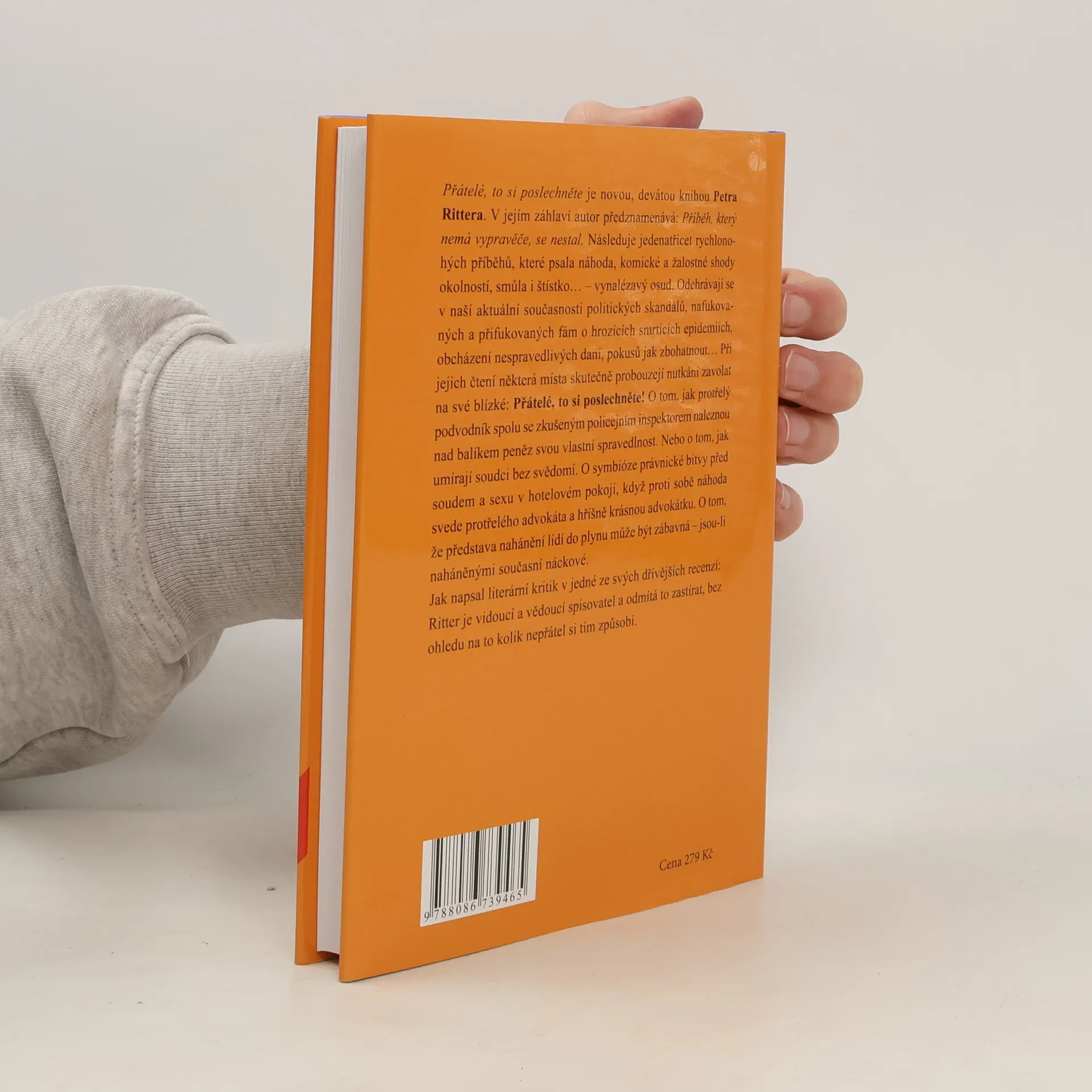 Přátelé, to si poslechněte je další, devátou knihou Petra Rittera. V jejím záhlaví autor předznamenává: Příběh, který nemá vypravěče, se nestal. Následuje jedenatřicet rychlonohých příběhů, které psala náhoda, komické a žalostné shody okolností, smůla i štístko… - vynalézavý osud. Odehrávají se v naší aktuální současnosti politických skandálů, nafukovaných a přifukovaných fám o hrozících smrtících epidemiích, obcházení nespravedlivých daní, pokusů jak zbohatnout… Při jejich čtení některá místa skutečně probouzejí nutkání zavolat na své blízké: Přátelé, to si poslechněte! O tom, jak protřelý podvodník spolu se zkušeným policejním inspektorem naleznou nad balíkem peněz svou vlastní spravedlnost. Nebo o tom, jak umírají soudci bez svědomí. O symbióze právnické bitvy před soudem a sexu v hotelovém pokoji, když proti sobě náhoda svede protřelého advokáta a hříšně krásnou advokátku. O tom, že představa nahánění lidí do plynu může být zábavná - jsou-li naháněnými současní náckové. Jak napsal literární kritik v jedné ze svých dřívějších recenzí: Ritter je vidoucí a vědoucí spisovatel a odmítá to zastírat, bez ohledu na to kolik nepřátel si tím způsobí.