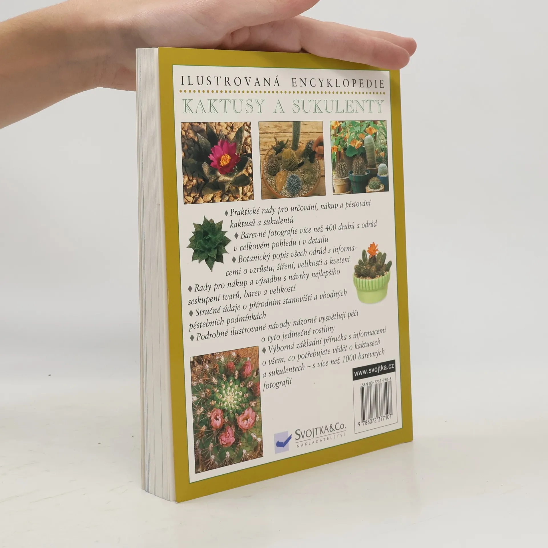 Tato bohatě ilustrovaná encyklopedie obsahuje: . Praktické rady pro určování, nákup a pěstování kaktusů a sukulentů . Barevné fotografie více než 400 druhů a odrůd v celkovém pohledu i v detailu . Botanický popis všech odrůd s informacemi o vzrůstu, šíření, velikosti a kvetení . Rady pro nákup a výsadbu s návrhy nejlepšího seskupení tvarů, barev a velikostí . Stručné údaje o přírodním stanovišti a vhodných pěstebních podmínkách . Podrobné ilustrované návody názorně vysvětlují péči o tyto jedinečné rostliny . Výborná základní příručka s informacemi o všem, co potřebujete vědět o kaktusech a sukulentech - s více než 1000 barevných fotografií
