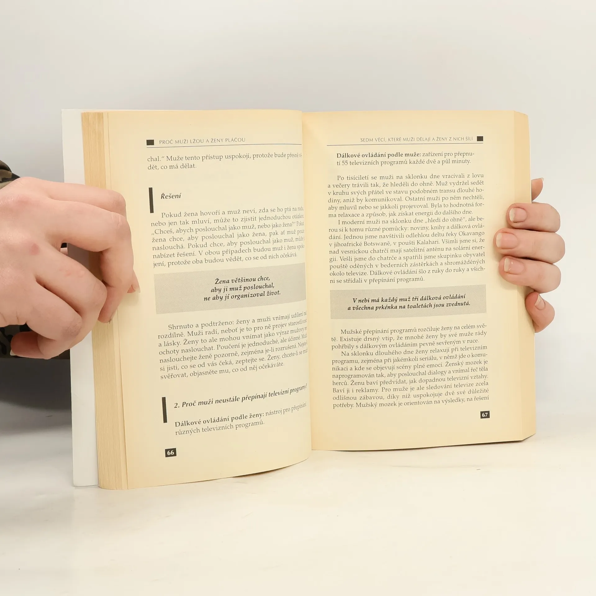 Kniha je pokračováním mimořádně úspěšného bestselleru "Proč muži neposlouchají a ženy neumí číst v mapách". Čtenáře znovu odzbrojí nenapodobitelná kombinace vědeckých poznatků, výsledků dlouholetého pozorování mezilidské komunikace a neodolatelného humoru. Kniha vám poskytne srozumitelný, humorný a někdy i šokující pohled na největší záhady ve vztazích mužů a žen. Díky ní se naučíte, jak jednou pro vždy skoncovat s nedorozuměními mezi muži a ženami a zlepšit své osobní i profesní vztahy s lidmi.