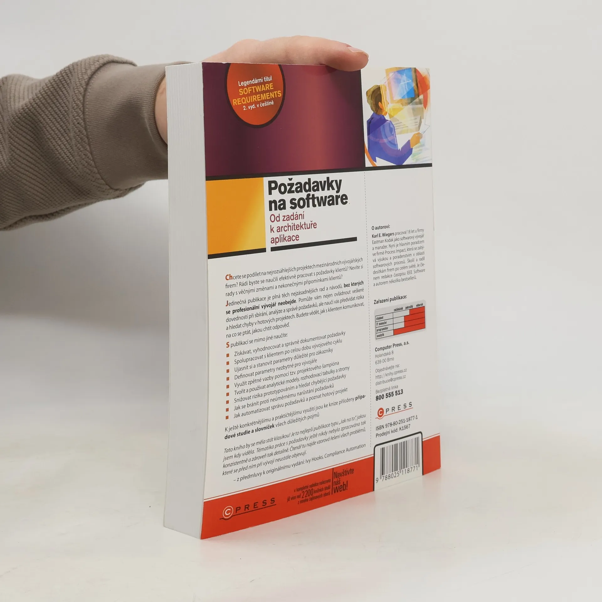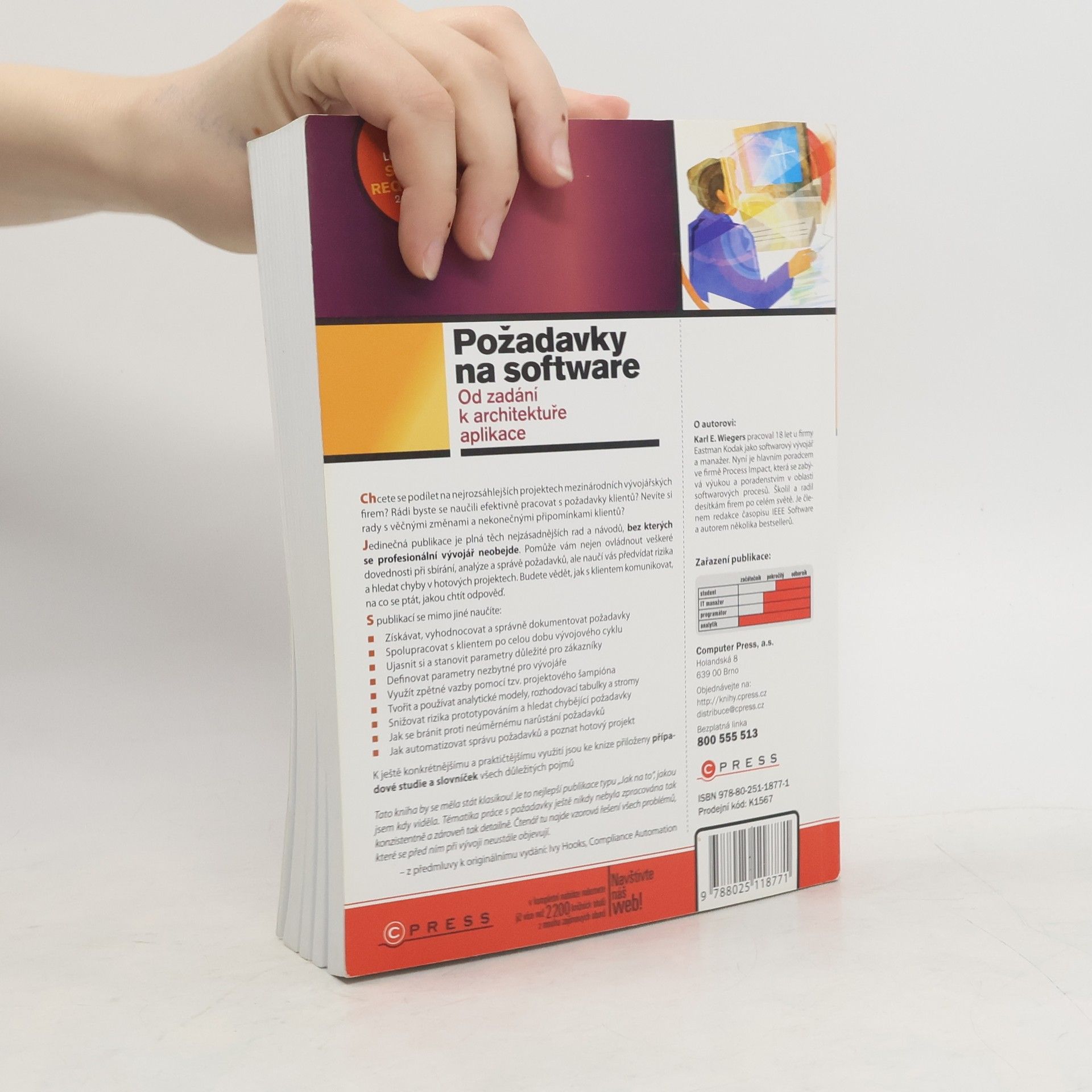 Jedinečná publikace je plná těch nejzásadnějších rad a návodů, bez kterých se profesionální vývojář neobejde. Pomůže vám nejen ovládnout veškeré dovednosti při sbírání, analýze a správě požadavků, ale naučí vás předvídat rizika a hledat chyby v hotových projektech. Budete vědět, jak s klientem komunikovat, na co se ptát, jakou chtít odpověď. K ještě konkrétnějšímu a praktičtějšímu využití jsou ke knize přiloženy případové studie a slovníček všech důležitých pojmů.