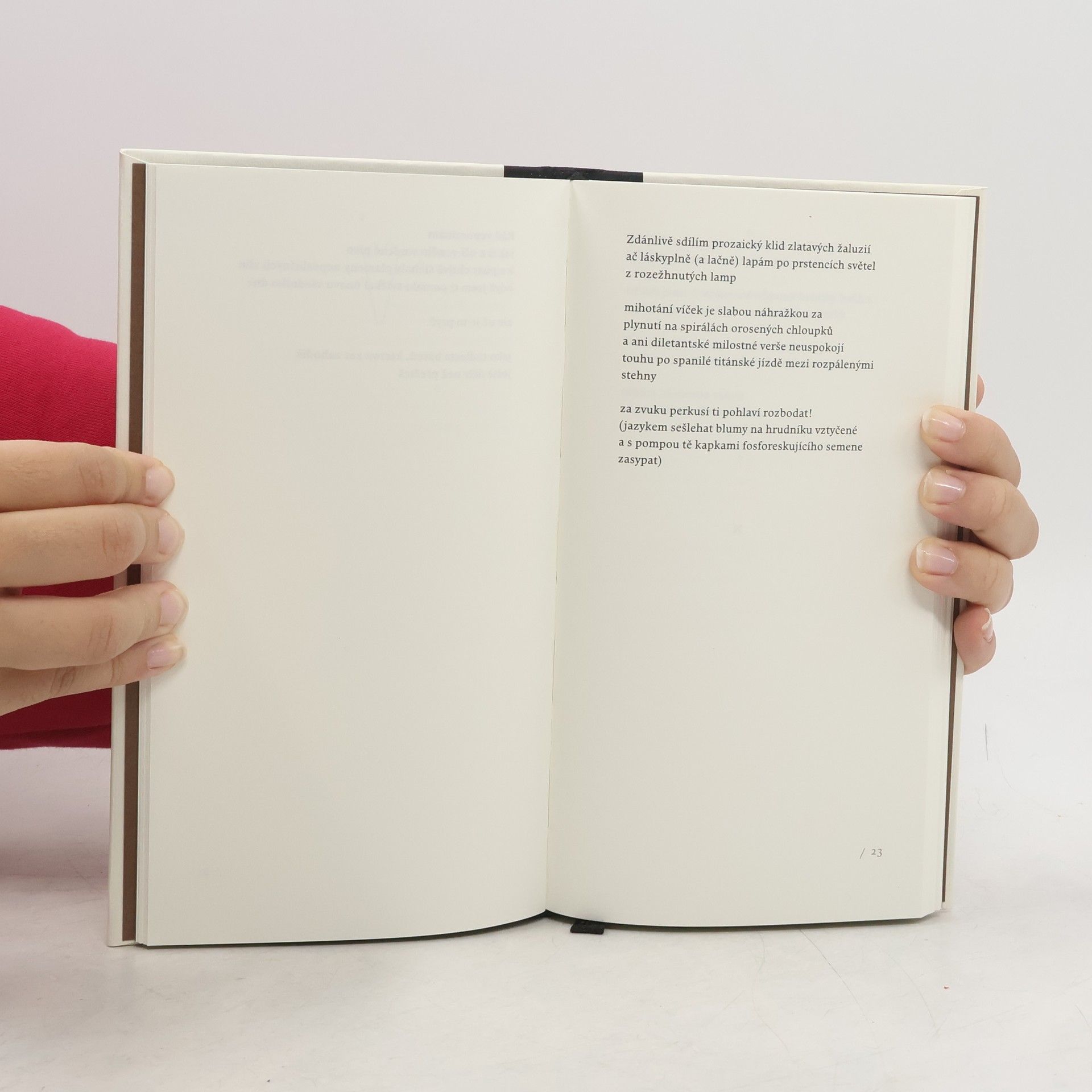 První sbírka knižního grafika, který se příležitostně věnuje i poezii (publikoval ji zejména na svých webových stránkách). Sousloví „autorská kniha“ zde platí doslova; výsledkem je exkluzivní artefakt, který všechny složky tvorby (literární, typografickou i „ideovou“) uvádí do harmonie. Výsledkem je sličná kniha s mírně perverzním obsahem. Citujme trefné věty z autorova slova na závěr: Nejmilejší věci vznikají z nadšení, zadarmo nebo z trucu. Největší prostor pro demonstraci vlastních schopností a názorů skýtají veškeré autorské projekty, do kterých je komukoliv zvenčí zakázáno vstupovat. Théâtre à domicile a akce v přírodě a perversní básnění a nahota na prodej představují jen některé možnosti, jak se realizovat, jsme-li osoby etherické, se sklony k exhibicionismu. Komu střevo není dáno a komu nahota nesluší, vezme s povděkem jakoukoliv jinou aktivitu, která mu dá aspoň šanci ve větší míře uplatnit svůj naturel. Autorské knihy patří do kategorie bezpečného umění, při němž se hrozba insultace pohoršeným davem snižuje prakticky na minimum. A možnost v jediném autorském objektu uplatnit sklony literární, grafomanské, výtvarné a typografické je k nezaplacení!