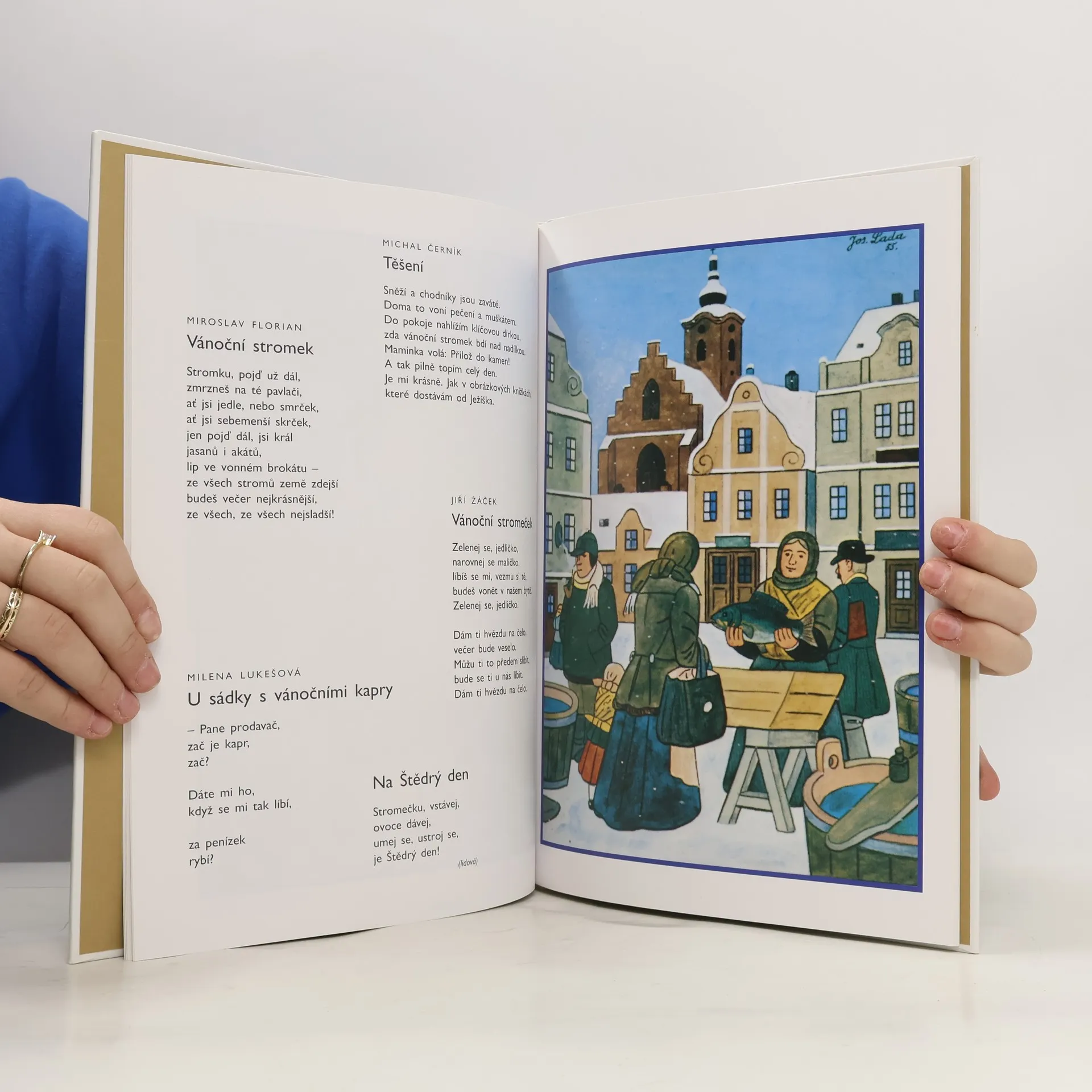 Když se někdo zmíní o malovaných vánočních pohlednicích, jen těžko si lze nevybavit kresby od známého malíře a spisovatele Josefa Lady. Jeho nezaměnitelný malířský rukopis doprovází již desetiletí vánoční pohlednice, dětské knížky a kalendáře. V této publikaci samozřejmě nemohou obrázky tohoto malíře chybět, a navíc jsou doplněny jeho básničkami a vyprávěním, jaké to bylo o Vánocích v malebných českých vesničkách před lety.