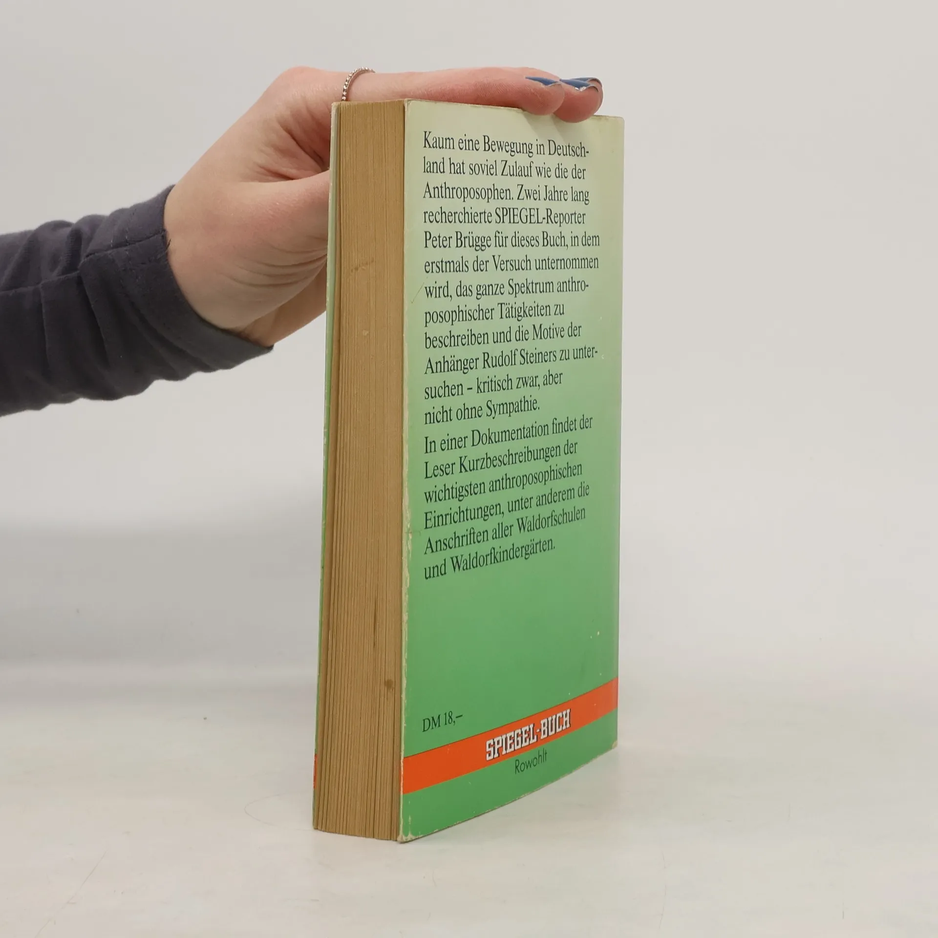 Kaum eine Bewegung in Deutschland hat soviel Zulauf wie die der Anthroposophen. Zwei Jahre lang recherchierte SPIEGEL-Reporter Peter Brügge fur dieses Buch, in dem erstmals der Versuch unternommen wird, das ganze Spektrum anthroposophischer Tätigkeiten zu beschreiben und die Motive der Anhinger Rudolf Steiners zu untersuchen – kritisch zwar, aber nicht ohne Sympathie. In einer Dokumentation findet der Leser Kurzbeschreibungen der wichtigsten anthroposophischen Einrichtungen, unter anderem die Anschriften aller Waldorfschulen und Waldorfkindergärten.