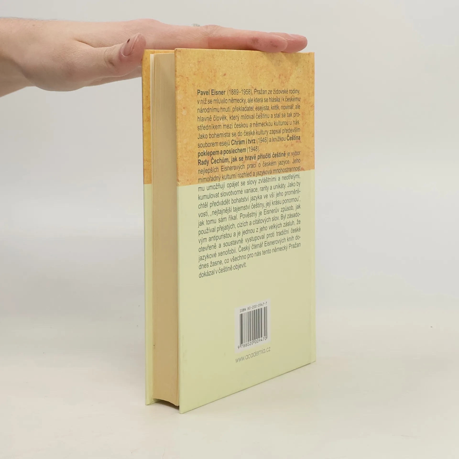 Pavel Eisner (1889-1958), Pražan ze židovské rodiny, v níž se mluvilo německy, ale která se hlásila i k českému národnímu hnutí, překladatel, esejista, kritik, novinář, ale hlavně člověk, který miloval češtinu a stal se tak prostředníkem mezi českou a německou kulturou u nás. Kniha Rady Čechům jak se hravě přiučiti češtině je výbor nejlepších Eisnerových prací o české jazyce.