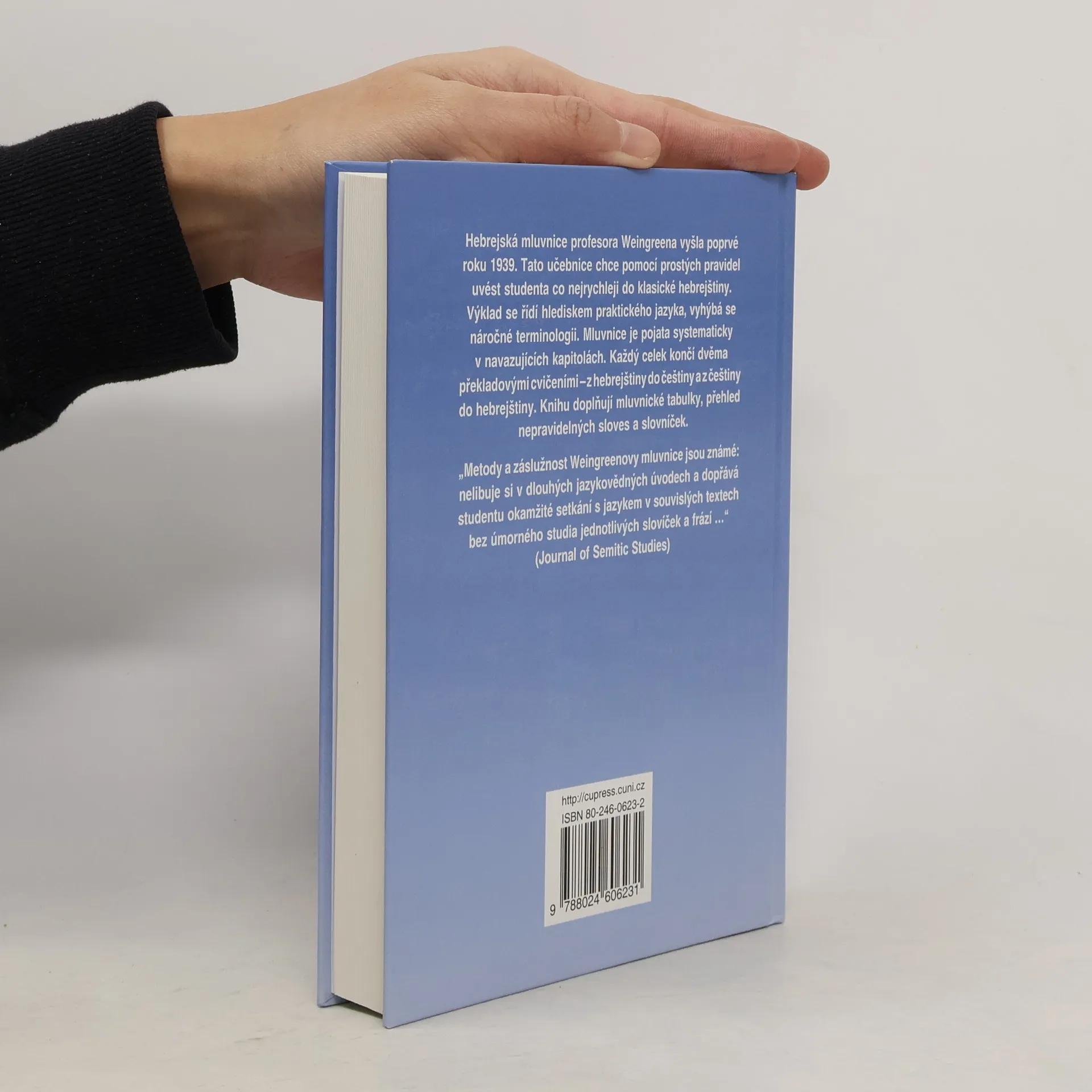 Druhé vydání mimořádně úspěšné učebnice hebrejského jazyka, zaměřené na studium biblických textů. Jejím hlavním cílem je seznámit čtenáře se specifickými rysy biblických textů, díky své přístupné formě však může posloužit také jako základní učebnice hebrejštiny pro začátečníky. Kromě výkladu gramatiky a ukázek textů, jež tvoří základ knihy, tu zájemce najde také množství cvičení, výklad o výslovnosti, mluvnické tabulky, přehled nepravidelných sloves a stručný slovníček.