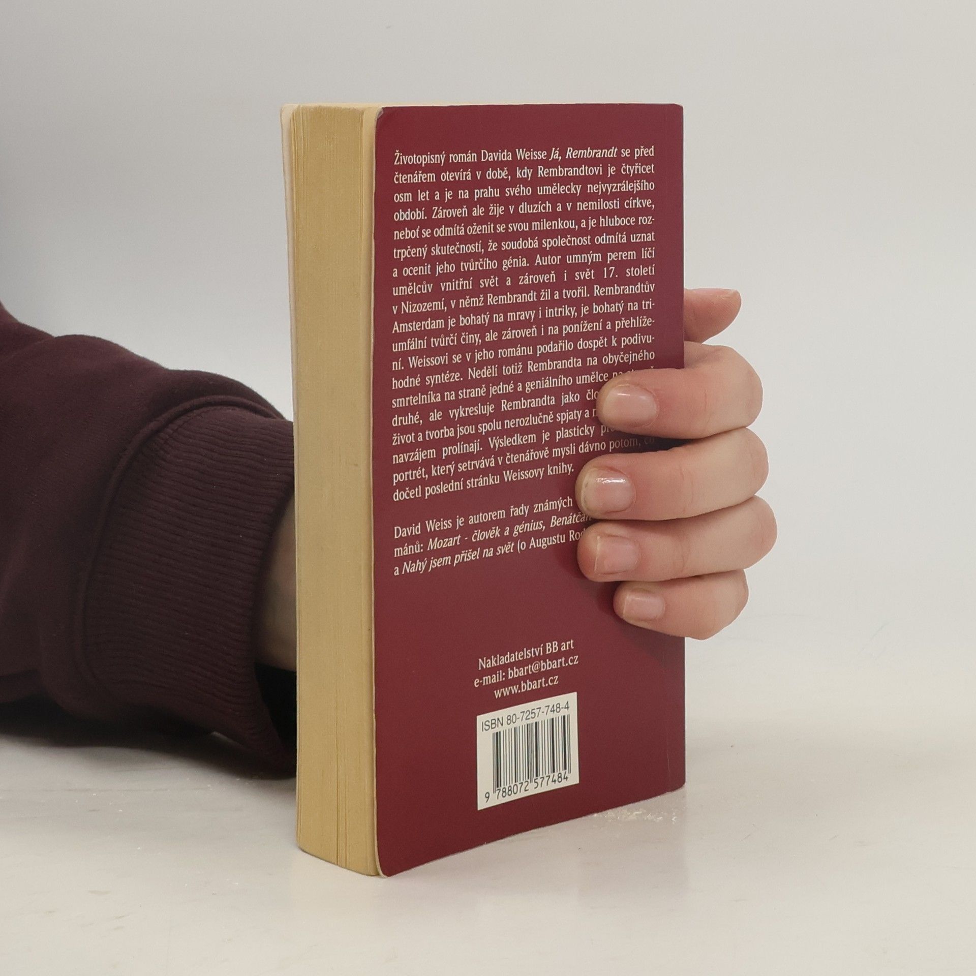 Životopisný román Davida Weisse Já, Rembrandt se před čtenářem otevírá v době, kdy Rembrandtovi je čtyřicet osm let a je na prahu svého umělecky nejvyzrálejšího období. Zároveň ale žije v dluzích a v nemilosti církve, neboť se odmítá oženit se svou milenkou, a je hluboce roztrpčený skutečností, že soudobá společnost odmítá uznat a ocenit jeho tvůrčího génia. Autor umným perem líčí umělcův vnitřní svět a zároveň i svět 17. století v Nizozemí, v němž Rembrandt žil a tvořil. Rembrandtův Amsterdam je bohatý na mravy i intriky, je bohatý na triumfální tvůrčí činy, ale zároveň i na ponížení a přehlížení. Weissovi se v jeho románu podařilo dospět k podivuhodné syntéze. Nedělí totiž Rembrandta na obyčejného smrtelníka na straně jedné a geniálního umělce na straně druhé, ale vykresluje Rembrandta jako člověka, jehož život a tvorba jsou spolu nerozlučně spjaty a nekonečně se navzájem prolínají. Výsledkem je plasticky přesvědčivý portrét, který setrvává v čtenářově mysli dávno potom, co dočetl poslední stránku Weissovy knihy. David Weiss je autorem řady známých biografických románů: Mozart - člověk a génius, Benátčan (o Tizianovi) a Nahý jsem přišel na svět (o Augustu Rodinovi).