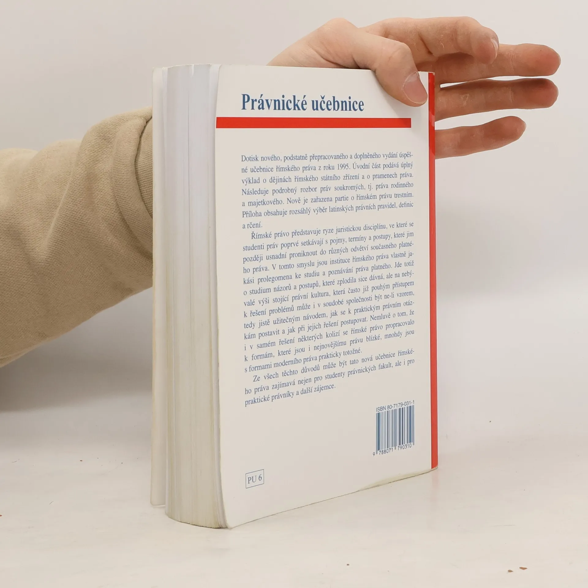 Dotisk nového, podstatně přepracovaného a doplněného vydání úspěšné učebnice římského práva z roku 1995. Úvodní část podává úplný výklad o dějinách římského státního zřízení a o pramenech práva. Následuje podrobný rzobor práv soukromých, tj. práva rodinného a majetkového. Nově je zařazena partie o římském právu trestním. Příloha obsahuje rozsáhlý výběr latinských právních pravidel, definic a rčení.