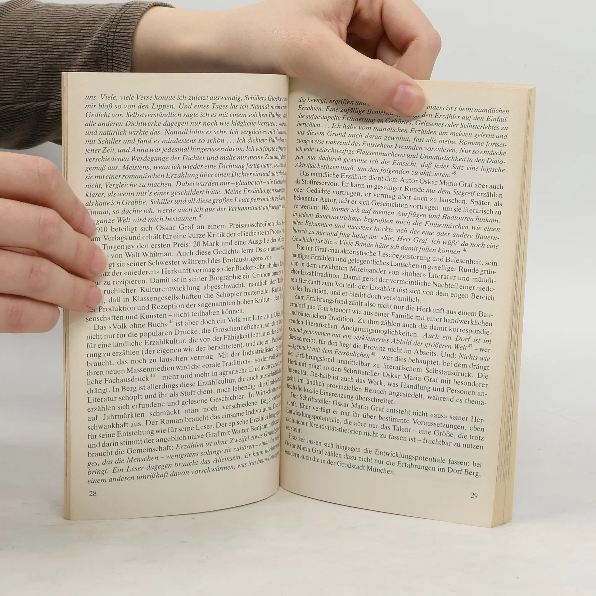 „Voralpen-Gorki“, „Lederhosenerzähler“, „bayrischer Boccaccio“, „naiver Stegreiferzähler“. - Etikettierungen dieser Art haften immer noch an Oskar Maria Graf. Er gilt als Naturbursche und Original, als schlitzohriger „Viechskerl“, der als „Porno-Graf“ erotische Schnurren präsentiert oder sich als „Erzähler von Geblüt“ auf „ländliche Sachen“ spezialisiert. Offenbar wird Graf, der fast sechzig Jahre in der Großstadt München und der Weltstadt New York verbrachte, sein provinzielles Lederhosen-Image nicht los. An diesem Bild ist der Autor nicht schuldlos. Oskar Maria Graf liebt die Maskerade, die Rolle des naiven Bauerntölpels oder die des käuflichen Literaten.