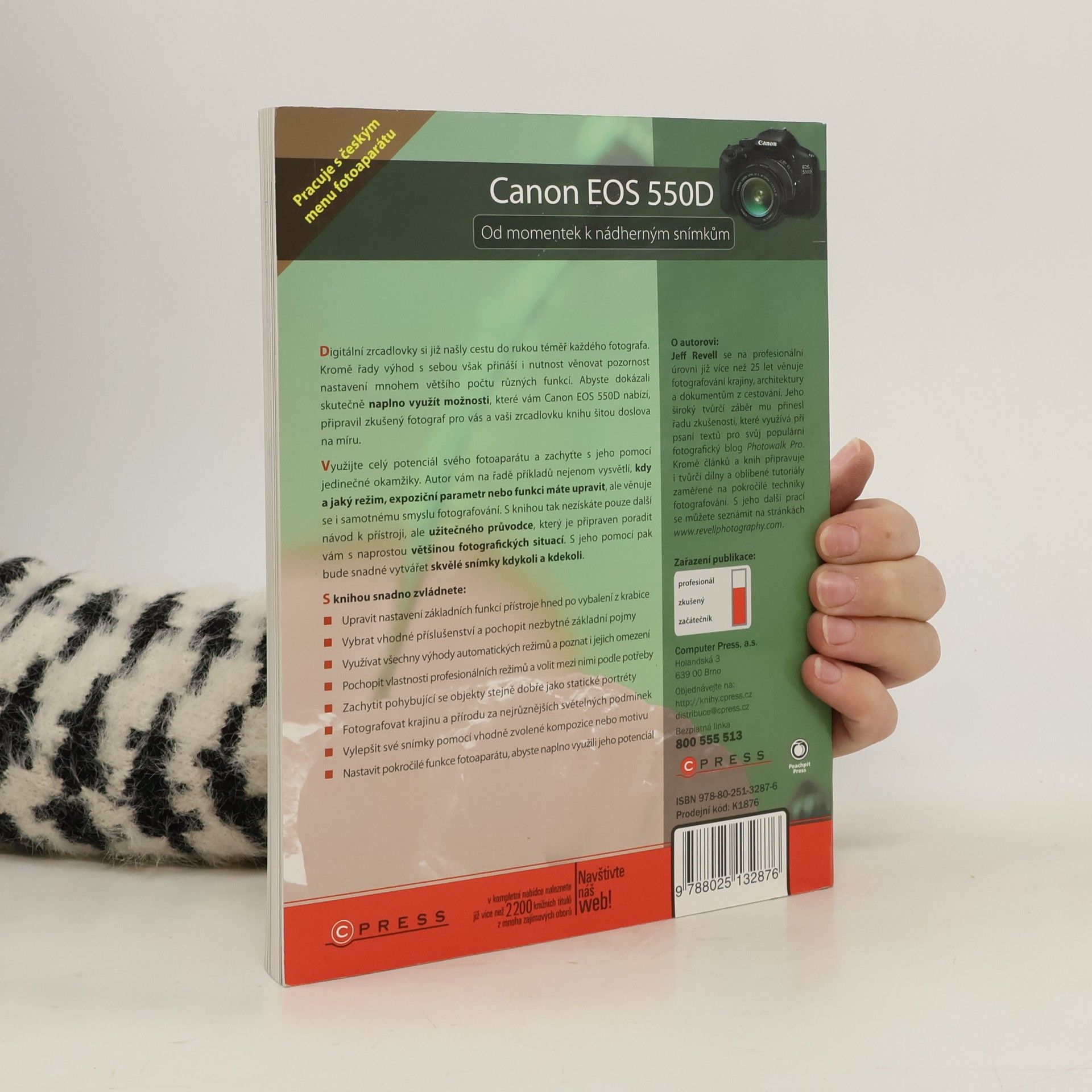 Digitální zrcadlovky si již našly cestu do rukou téměř každého fotografa. Kromě řady výhod s sebou však přináší i nutnost věnovat pozornost nastavení mnohem většího počtu různých funkcí. Abyste dokázali skutečně naplno využít možnosti, které vám Canon EOS 550D nabízí, připravil zkušený fotograf pro vás a vaši zrcadlovku knihu šitou doslova na míru. Využijte celý potenciál svého fotoaparátu a zachyťte s jeho pomocí jedinečné okamžiky. Autor vám na řadě příkladů nejenom vysvětlí, kdy a jaký režim, expoziční parametr nebo funkci máte upravit, ale věnuje se i samotnému smyslu fotografování. S knihou tak nezískáte pouze další návod k přístroji, ale užitečného průvodce, který je připraven poradit vám s naprostou většinou fotografických situací. S jeho pomocí pak bude snadné vytvářet skvělé snímky kdykoli a kdekoli. S knihou snadno zvládnete: * Upravit nastavení základních funkcí přístroje hned po vybalení z krabice * Vybrat vhodné příslušenství a pochopit nezbytné základní pojmy * Využívat všechny výhody automatických režimů a poznat i jejich omezení * Pochopit vlastnosti profesionálních režimů a volit mezi nimi podle potřeby * Zachytit pohybující se objekty stejně dobře jako statické portréty * Fotografovat krajinu a přírodu za nejrůznějších světelných podmínek * Vylepšit své snímky pomocí vhodně zvolené kompozice nebo motivu * Nastavit pokročilé funkce fotoaparátu, abyste naplno využili jeho potenciál