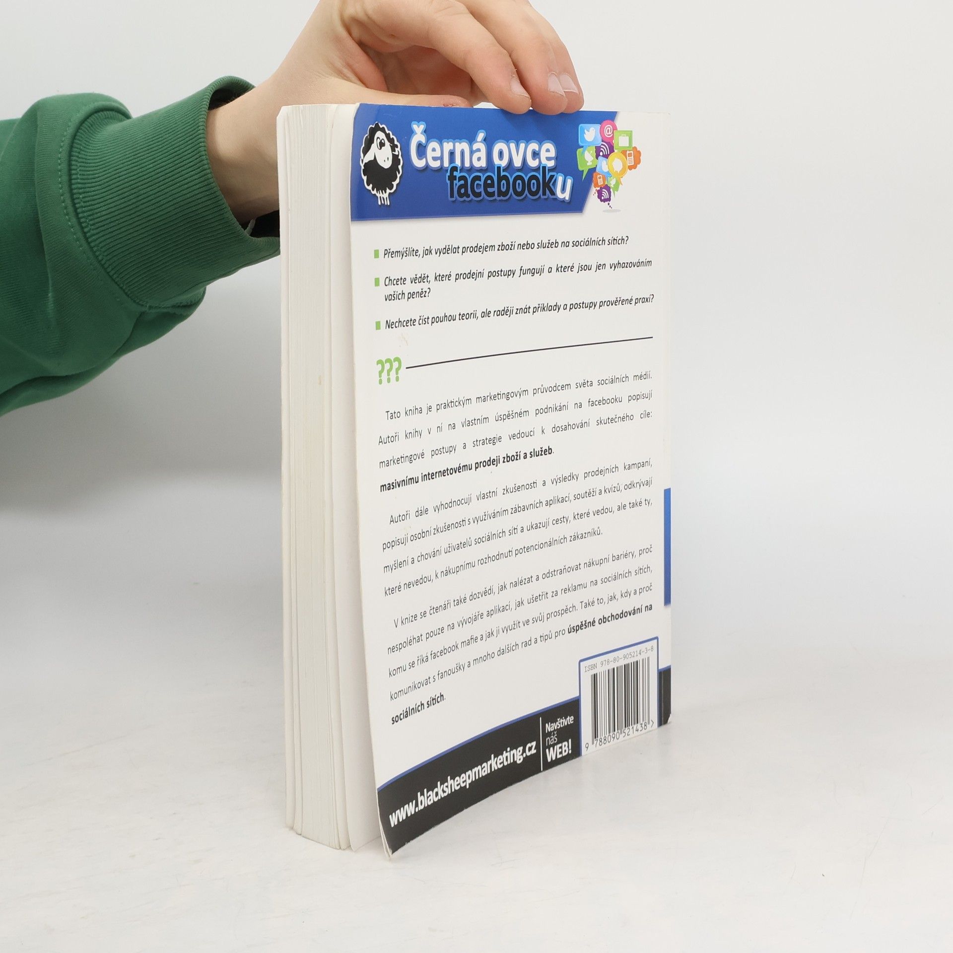 Přemýšlíte, jak vydělat prodejem zboží nebo služeb na sociálních sítích?Chcete vědět, které prodejní postupy fungují a které jsou jen vyhazováním Vašich peněz? Nechcete číst pouhou teorii, ale raději znát příklady a postupy prověřené praxí? Pak je tato kniha určena právě Vám! Kniha Černá ovce facebooku je praktickým marketingovým průvodcem světa sociálních médií. Autoři knihy v ní na vlastním úspěšném podnikání na facebooku popisují marketingové postupy a strategie vedoucí k dosahování skutečného cíle: masivnímu internetovému prodeji zboží a služeb. Autoři dále vyhodnocují vlastní zkušenosti a výsledky prodejních kampaní, popisují osobní zkušenosti s využíváním zábavních aplikací, soutěží a kvízů, odkrývají myšlení a chování uživatelů sociálních sítí a ukazují cesty, které vedou, ale také ty, které nevedou, k nákupnímu rozhodnutí potencionálních zákazníků. V knize se čtenáři také dozvědí, jak nalézat a odstranit nákupní bariéry, proč nespoléhat pouze na vývojáře aplikací, jak ušetřit za reklamu na sociálních sítích, komu se říká facebook mafie a jak ji využít ve svůj prospěch, jak, kdy a proč komunikovat s fanoušky a mnoho dalších rad a tipů pro úspěšné obchodování na sociálních sítích.