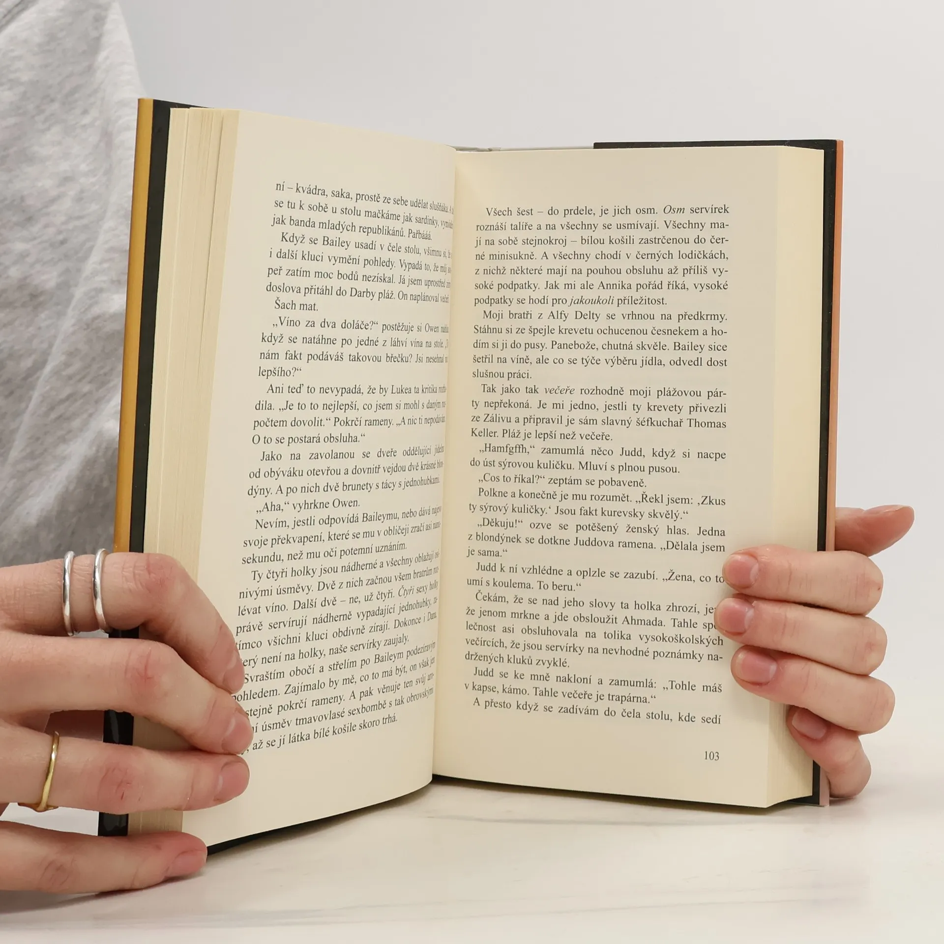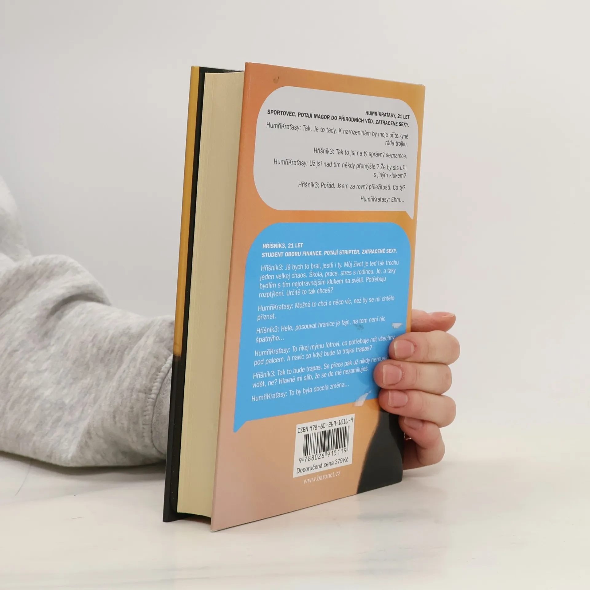 HumříKraťasy, 21 let Sportovec. Potají magor do přírodních věd. Zatraceně sexy. HumříKraťasy: Tak. Je to tady. K narozeninám by moje přítelkyně ráda trojku. Hříšník3: Tak to jsi na tý správný seznamce. HumříKraťasy: Už jsi nad tím někdy přemýšlel? Že by sis užil s jiným klukem? Hříšník3: Pořád. Jsem za rovný příležitosti. Co ty? HumříKraťasy: Ehm… Hříšník3, 21 let Student oboru finance. Potají striptér. Zatraceně sexy. Hříšník3: Já bych to bral, jestli i ty. Můj život je teď tak trochu jeden velkej chaos. Škola, práce, stres s rodinou. Jo, a taky bydlím s tím nejotravnějším klukem na světě. Potřebuju rozptýlení. Určitě to tak chceš? HumříKraťasy: Možná to chci o něco víc, než by se mi chtělo přiznat. Hříšník3: Hele, posouvat hranice je fajn, na tom není nic špatnýho… HumříKraťasy:To říkej mýmu fotrovi, co potřebuje mít všechny pod palcem. A navíc co když bude ta trojka trapas? Hříšník3: Tak to bude trapas. Se přece pak už nikdy nemusíme vidět, ne? Hlavně mi slib, že se do mě nezamiluješ. HumříKraťasy: To by byla docela změna…