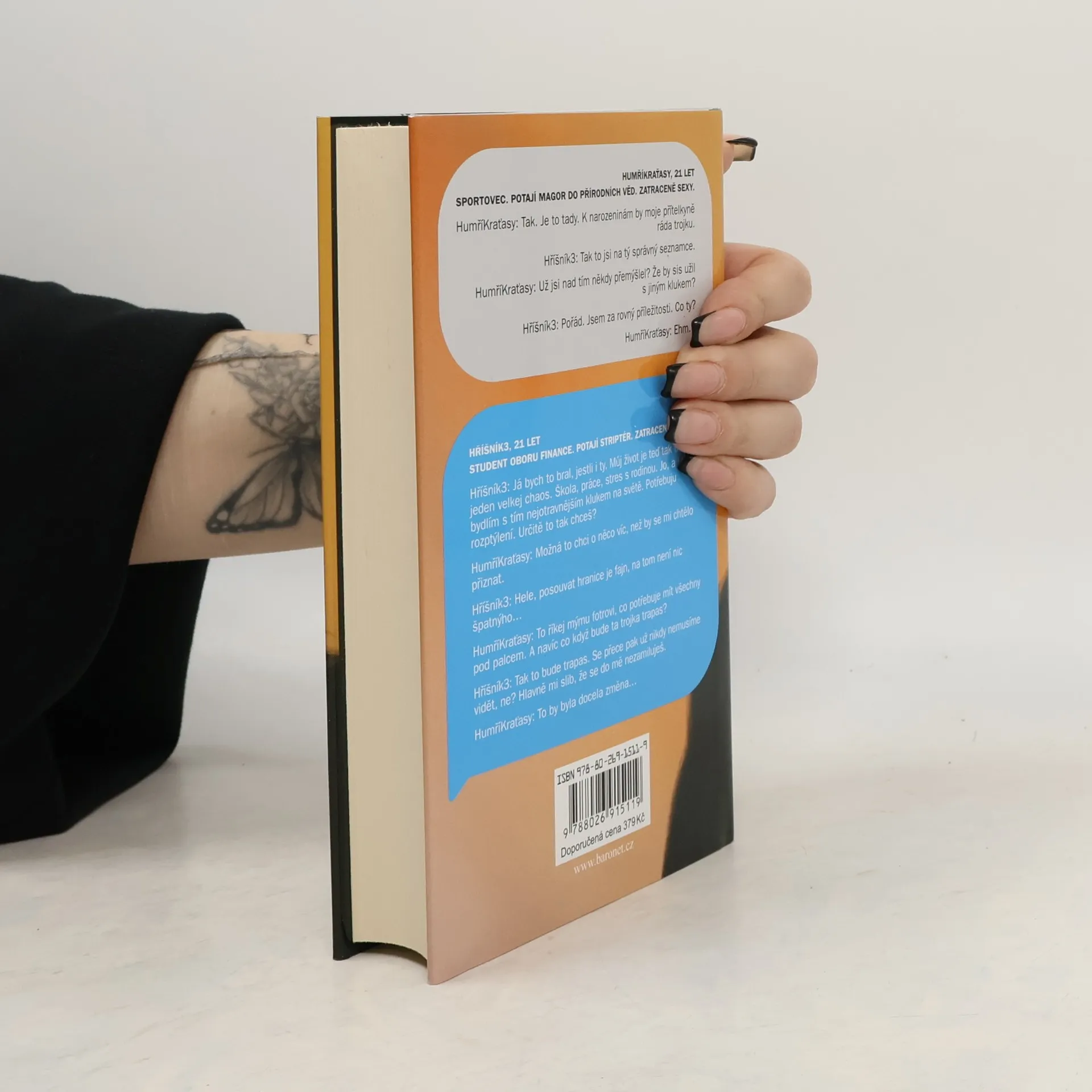 HumříKraťasy, 21 let Sportovec. Potají magor do přírodních věd. Zatraceně sexy. HumříKraťasy: Tak. Je to tady. K narozeninám by moje přítelkyně ráda trojku. Hříšník3: Tak to jsi na tý správný seznamce. HumříKraťasy: Už jsi nad tím někdy přemýšlel? Že by sis užil s jiným klukem? Hříšník3: Pořád. Jsem za rovný příležitosti. Co ty? HumříKraťasy: Ehm… Hříšník3, 21 let Student oboru finance. Potají striptér. Zatraceně sexy. Hříšník3: Já bych to bral, jestli i ty. Můj život je teď tak trochu jeden velkej chaos. Škola, práce, stres s rodinou. Jo, a taky bydlím s tím nejotravnějším klukem na světě. Potřebuju rozptýlení. Určitě to tak chceš? HumříKraťasy: Možná to chci o něco víc, než by se mi chtělo přiznat. Hříšník3: Hele, posouvat hranice je fajn, na tom není nic špatnýho… HumříKraťasy:To říkej mýmu fotrovi, co potřebuje mít všechny pod palcem. A navíc co když bude ta trojka trapas? Hříšník3: Tak to bude trapas. Se přece pak už nikdy nemusíme vidět, ne? Hlavně mi slib, že se do mě nezamiluješ. HumříKraťasy: To by byla docela změna…