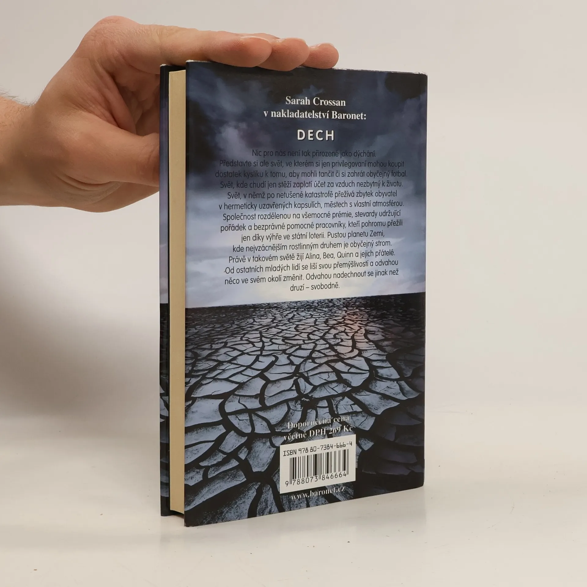 Nic pro nás není tak přirozené jako dýchání. Představte si ale svět, ve kterém si jen privilegovaní mohou koupit dostatek kyslíku k tomu, aby mohli tančit či si zahrát obyčejný fotbal. Svět, kde chudí jen stěží zaplatí účet za vzduch nezbytný k životu. Svět, v němž po netušené katastrofě přežívá zbytek obyvatel v hermeticky uzavřených městech s vlastní atmosférou. Pustou planetu Zemi, kde nejvzácnějším rostlinným druhem je obyčejný strom. Právě v takovém světě žije Alina, Bea, Quinn a jejich přátelé. Od ostatních mladých lidí se liší svou přemýšlivostí a odvahou něco ve svém okolí změnit. Odvahou nadechnout se jinak než druzí – svobodně. Dystopický román mladé irsko-americké autorky plný dobrodružství, při němž se doslova tají dech.