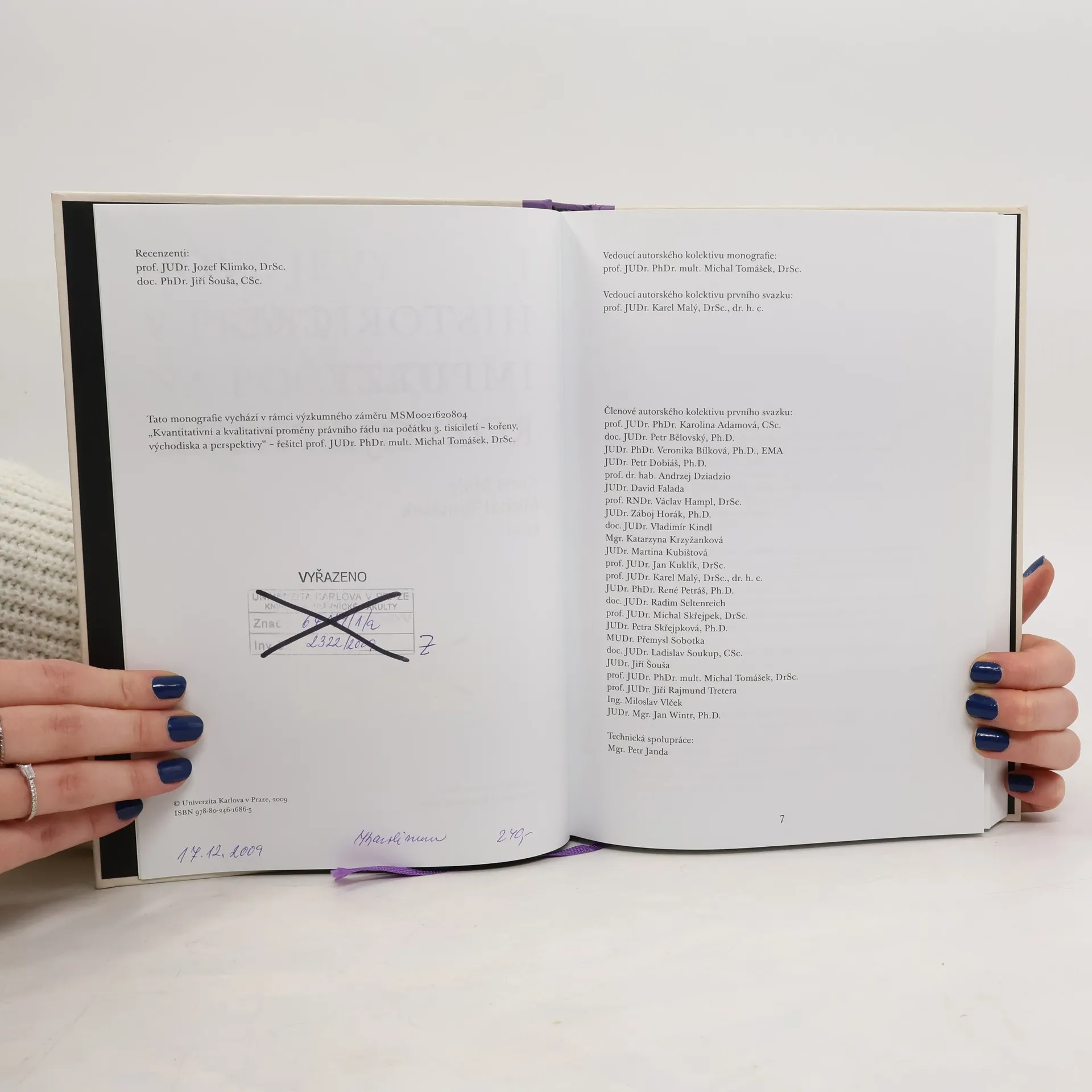 První díl pětisvazkové monografie se zaměřuje na roli historické zkušenosti při utváření nového práva. Kolektiv autorů z Právnické fakulty Univerzity Karlovy zkoumá, jak může právní historie přispět k transformaci a tvorbě nového práva, a jaké poznatky může nabídnout pro současnou legislativu a právní teorii. Práce se opírá o otázku proměnnosti práva a jeho historických kořenů, včetně vlivu domácí a evropské tradice, která vychází z antického myšlení a kanonického práva. Právní historie poskytuje mapu vývoje právního řádu, nahrazující společenské experimenty, které často skončily tragicky. Tímto způsobem může významně přispět k vývoji platného práva a současné legislativě. Analýzou historických koncepcí a právních teorií, stejně jako konkrétními příklady staré legislativy a praxe, přináší ověřitelné doklady o možnostech i nemožnostech právní úpravy společenských vztahů. Tato problematika se týká nejen období do roku 1989, ale i současného demokratického právního řádu, který je stále ve fázi překonávání a jehož praxe se často vrací k hlubokým historickým kořenům.