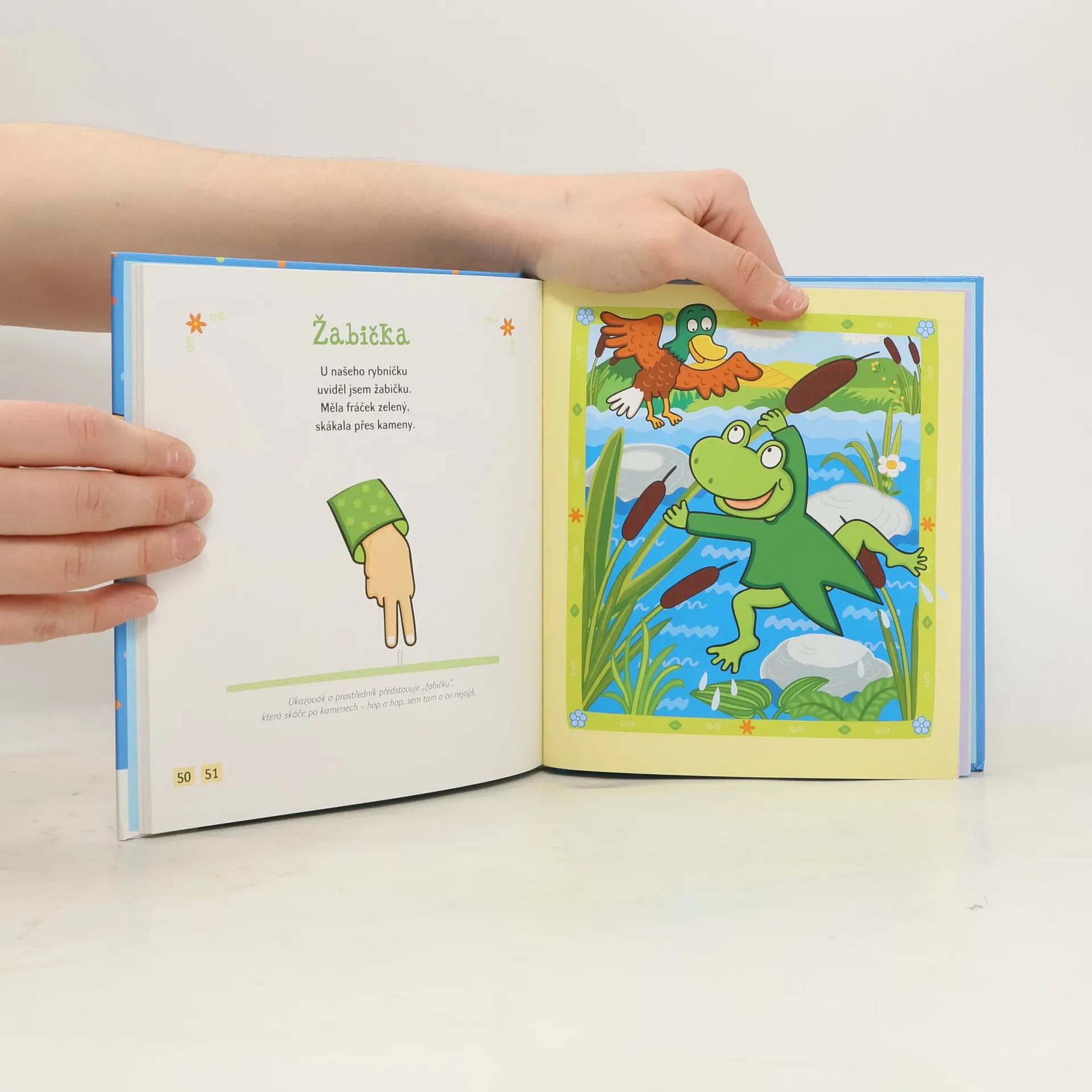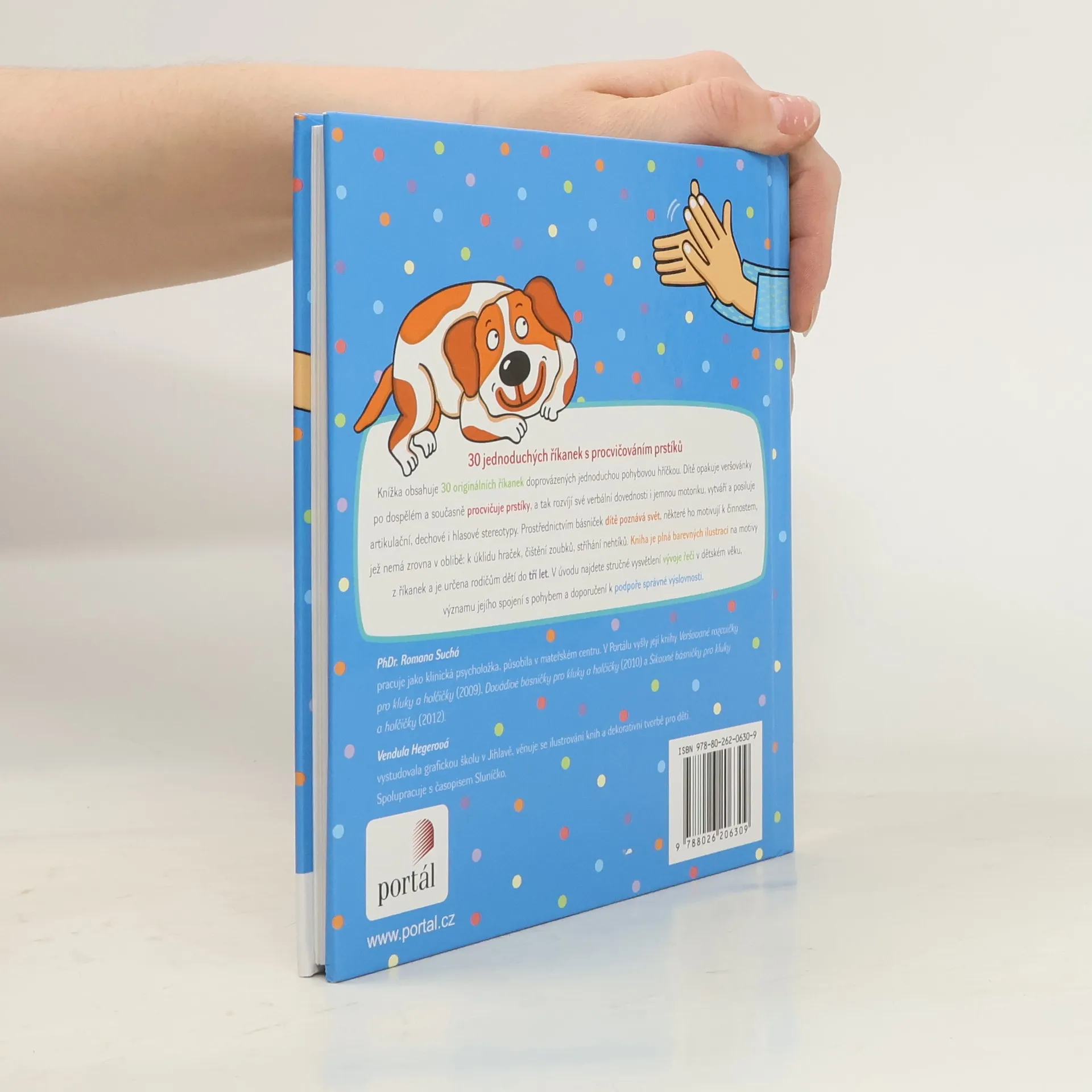 30 jednoduchých říkanek s procvičováním prstíků Knížka obsahuje 30 originálních říkanek doprovázených jednoduchými pohybovými hříčkami. Dítě opakuje veršovánky po dospělém a současně procvičuje prstíky, a tak rozvíjí své verbální dovednosti i jemnou motoriku, vytváří a posiluje artikulační, dechové i hlasové stereotypy. Prostřednictvím básniček dítě poznává svět, některé ho motivují k činnostem, jež nemá právě v oblibě – k úklidu hraček, čištění zoubků, stříhání nehtíků. Kniha je plná barevných ilustrací na motivy z říkanek a je určena rodičům dětí do tří let. V úvodu najdete stručné vysvětlení vývoje řeči v dětském věku, významu jejího spojení s pohybem a doporučení k podpoře správné výslovnosti.