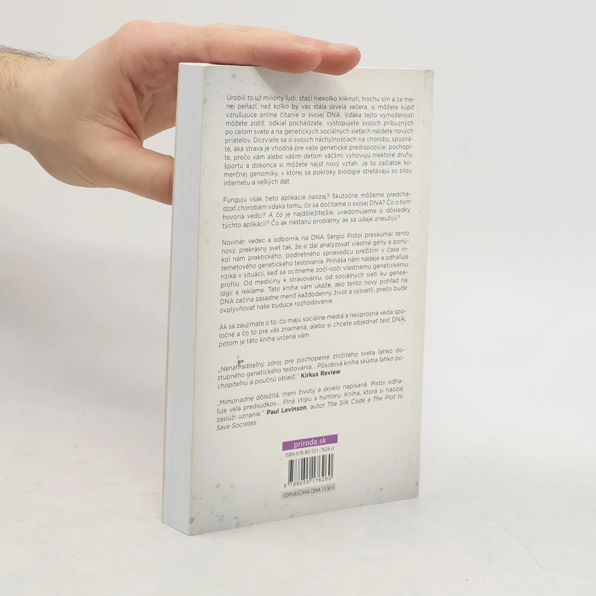 Urobili to už milióny ľudí: stačí niekoľko kliknutí a trochu slín. Vďaka tejto vymoženosti môžete zistiť, odkiaľ pochádzate, vystopovať príbuzných a nájsť nových priateľov na genetických sociálnych sieťach. Fungujú však tieto aplikácie naozaj? Môžeme predchádzať chorobám na základe informácií o svojej DNA? Čo hovoria vedci a aké sú dôsledky týchto aplikácií? Aké problémy môžu nastať, ak sa údaje zneužijú? Kniha vás prevedie témami od medicíny po stravovanie, od sociálneho internetu po genealógiu, a ukáže, ako nový pohľad na DNA mení každodenný život. Kapitoly sa zaoberajú témami ako genetické spojenia, hra s DNA, predpovedanie zdravotných problémov, vlastníctvo dát a praktické rady. Zistíte, ako sa stať pľuvačom slín, objavíte genetikou ovplyvnené aspekty života a zdravotnej budúcnosti, a zamyslíte sa nad ochranou vašich osobných údajov. Kniha ponúka aj praktické informácie o komerčnej genomike a genetických poradenských organizáciách. Prvé vydanie.