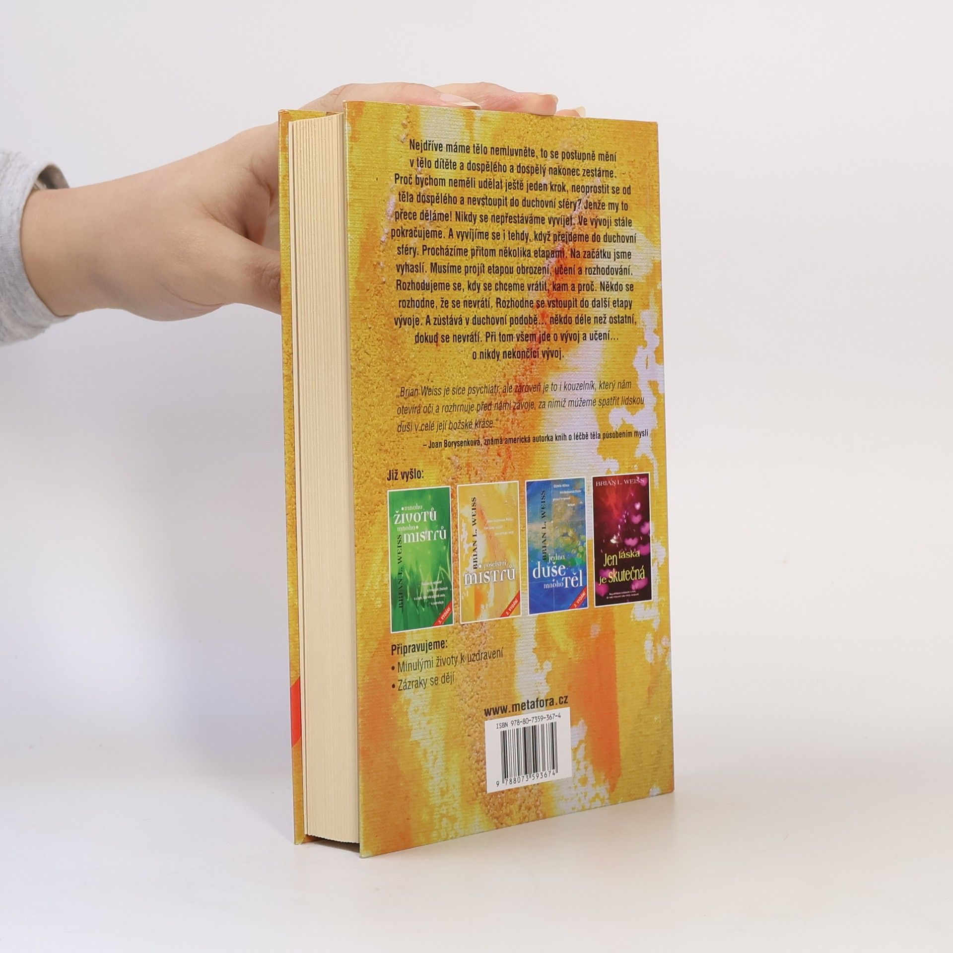 Od autora bestsellerů Mnoho mistrů, mnoho životů a Jedna duše, mnoho těl Briana L. Weisse. Zatímco ve svých předešlých knihách se dr. Weiss zabýval spíš vlivem minulých životů na současné životy lidí, v tomto díle se zaměřil na nadčasové, blahodárné a vpravdě božské působení netělesných bytostí, jež jsou zasvěceným známé coby Mistři. Tito moudří duchovní průvodci bdí nad našimi osudy a je jen na každém z nás, zda se rozhodne jejich velkorysé nabídky využít. Pro každičkého člověka na této planetě má totiž planetě má totiž duchovní svět přichystáno nekonečné množství všemocné síly, jíž se v tomto vesmíru nic nevyrovná. Ta síla má jméno láska… O tom, že se nejedná o žádné naivní pohádky svědčí kromě nesporné vědecké prestiže autora také množství autentických výpovědí osob, které se podrobily regresi. Kniha proto obsahuje skutečná, přesná a doslovná poselství duchovních Mistrů, která byla při sezeních zaznamenána. Doplňují ji texty meditačních technik, které čtenář může s úspěchem vyzkoušet sám na sobě a otevřít si tak cestu ke zdroji nekonečné jednoty a síly. Učení duchovních Mistrů, hlas lásky volající přes propast světů. 3. vydání.