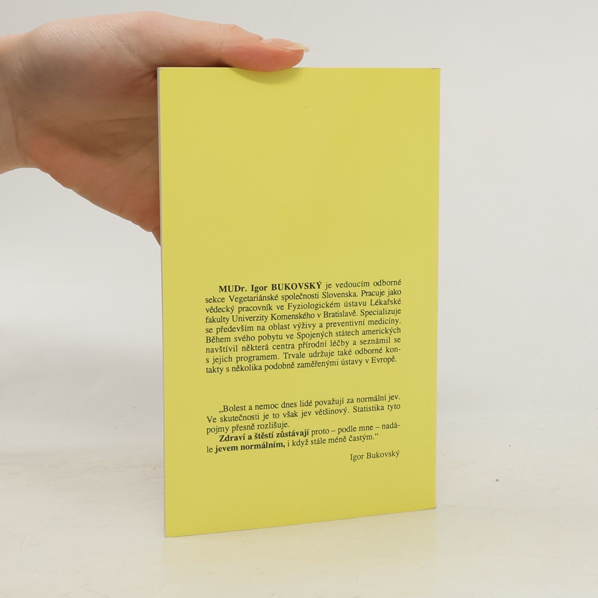 MUDr. Igor Bukovský je odborným asistentem a vědeckým pracovníkem Fyziologického ústavu Lékařské fakulty v Bratislavě. Výživou a preventivním lékařstvím se zabývá od roku 1990. Od r. 1991 se pravidelně účastní všech významných evropských a světových kongresů o výživě a fyziologii člověka. Od r. 1990 veřejně přednáší a publikuje. Je autorem řady rozhlasových a televizních pořadů a novinových článků. Napsal knihy Hledá se zdravý člověk a Vegetariánské dítě. Je členem Britské společnosti pro výživu, Americké společnosti pro klinickou výživu a několika domácích odborných společností. Výzkumná práce dr. Bukovského je zaměřena na vliv oxidací a antioxidantů na raná stadia aterosklerózy. Knížka chce být přehledným a stručným návodem, jak léčit některá častá onemocnění - stravou, úpravou stylu života, bylinkami a zeleninovými šťávami nebo u nás ještě málo známou vodoléčbou.