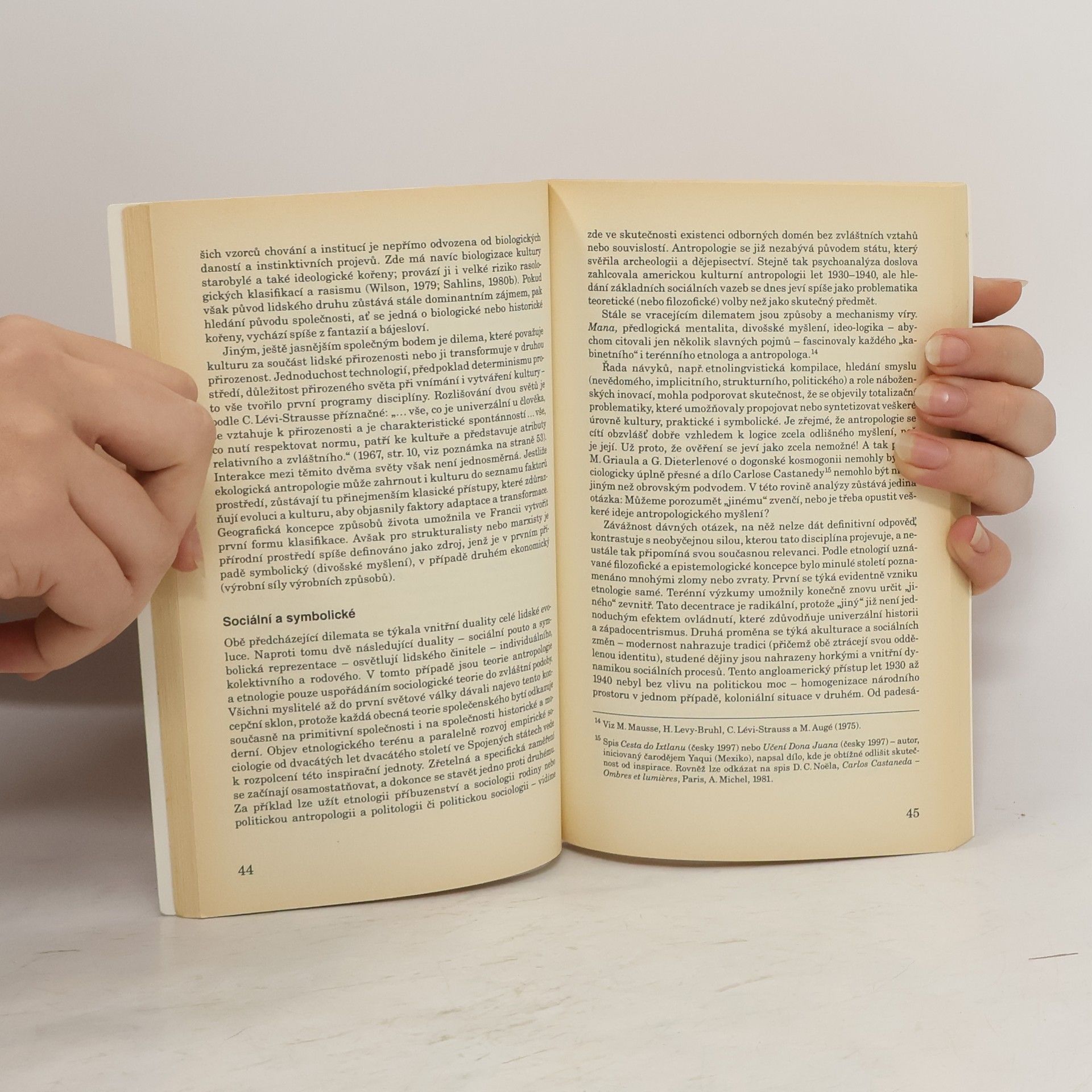 Francouzská koncepce vymezení společenskovědních oborů kulturní a sociální antropologie a etnologie. Francouzský profesor sociologie a antropologie definuje zmíněné obory jako sociální vědy zkoumající člověka, lidské společnosti a kultury na základě terénních výzkumů. Nastiňuje jejich vývoj, cíle, teorie, směry, předměty studia, ale především také jejich vlastní definice, které nejsou zcela jednotné (americká versus britská koncepce kulturní a sociální antropologie i etnologie). Ve francouzském pojetí se pojem antropologie (ve smyslu kulturní a sociální antropologie) překrývá s etnologií. Jedná se de facto o totožné obory. Od 60. let se preferuje používání globálnějšího a výstižnějšího pojmu antropologie. Kniha je určena studentům a zájemcům o sociální vědy zabývající se studiem člověka a kultury. Text je odborný, ale srozumitelný, přeložený odborníky. V závěru knihy jsou uvedeny prameny dostupné v českém, slovenském a anglickém jazyce a seznam některých významných českých antropologických a etnologických pracovišť.