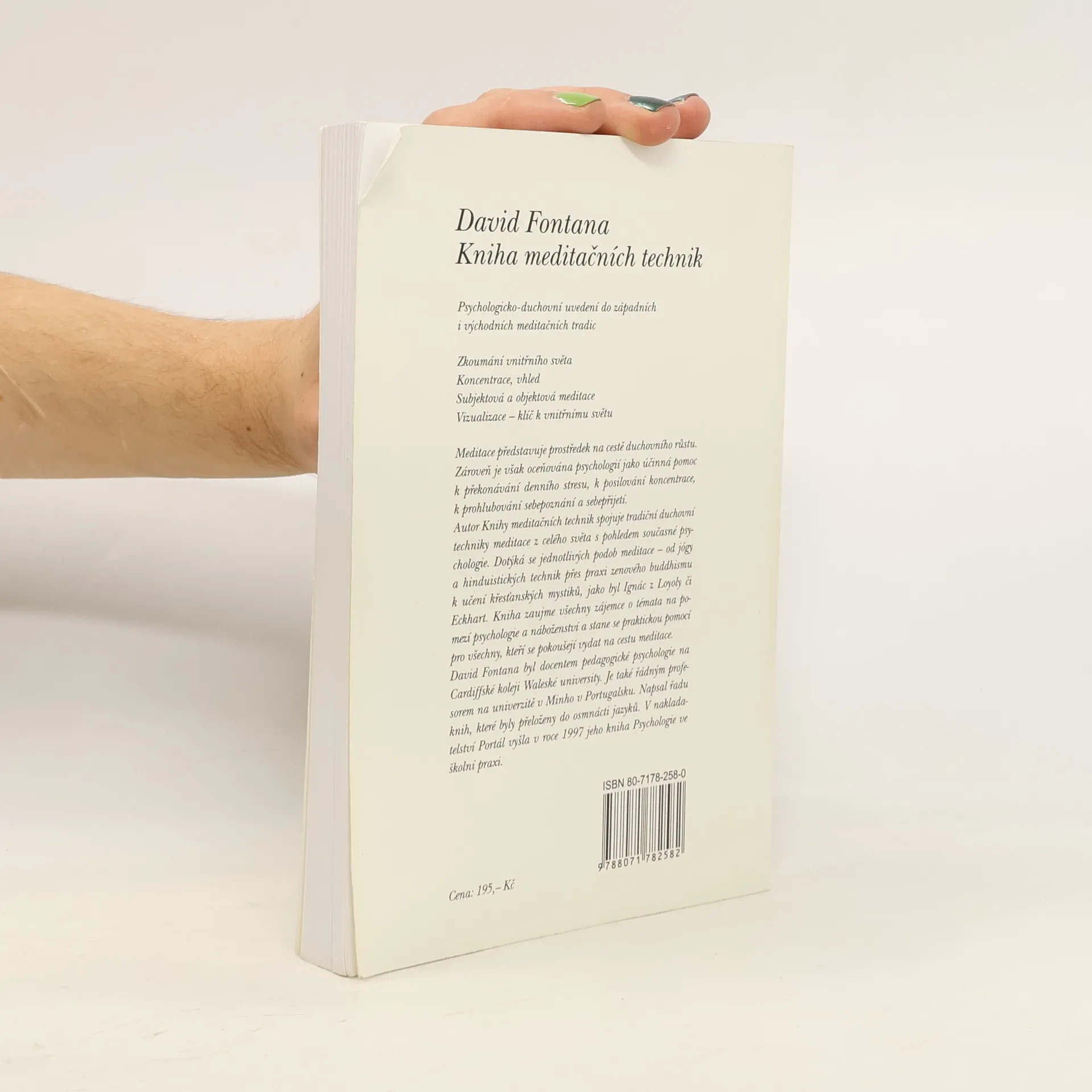 Psychologicko-duchovní uvedení do západních i východních meditačních tradic Zkoumání vnitřního světa Koncentrace, vhled Subjektová a objektová meditace Vizualizace - klíč k vnitřnímu světu Meditace představuje prostředek na cestě duchovního růstu. Zároveň je však oceňována psychologií jako účinná pomoc k překonávání denního stresu, k posilování koncentrace, k prohlubování sebepoznání a sebepřijetí. Autor Knihy meditačních technik spojuje tradiční duchovní techniky meditace z celého světa s pohledem současné psychologie. Dotýká se jednotlivých podob meditace — od jógy a hinduistických technik přes praxi zenového buddhismu k učení křesťanských mystiků, jako byl Ignác z Loyoly či Eckhart. Kniha zaujme všechny zájemce o témata na pomezí psychologie a náboženství a stane se praktickou pomocí pro všechny, kteří se pokoušejí vydat na cestu meditace. David Fontána byl docentem pedagogické psychologie na Cardiffské koleji Waleské university. Je také řádným profesorem na univerzitě v Minho v Portugalsku. Napsal řadu knih, které byly přeloženy do osmnácti jazyků.
