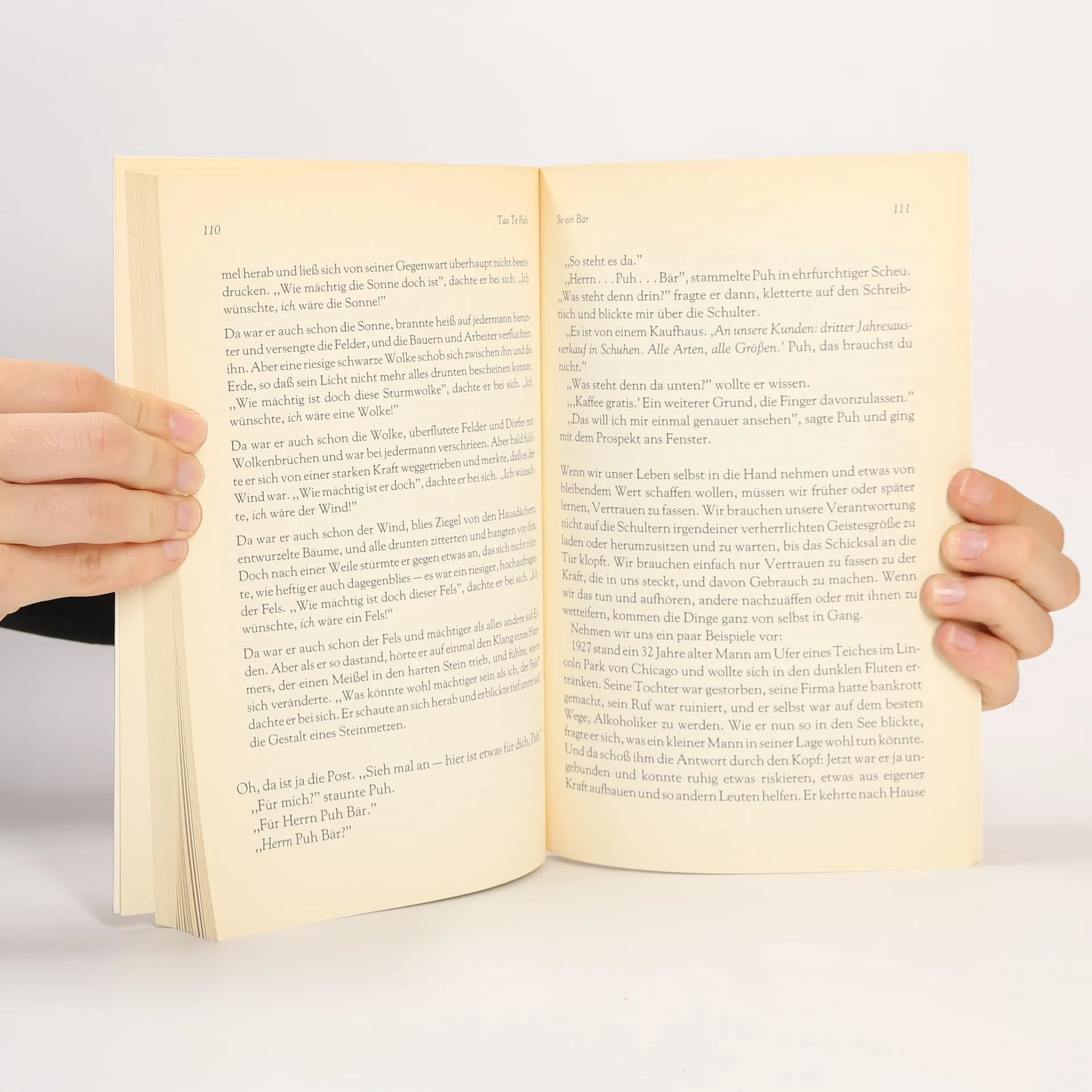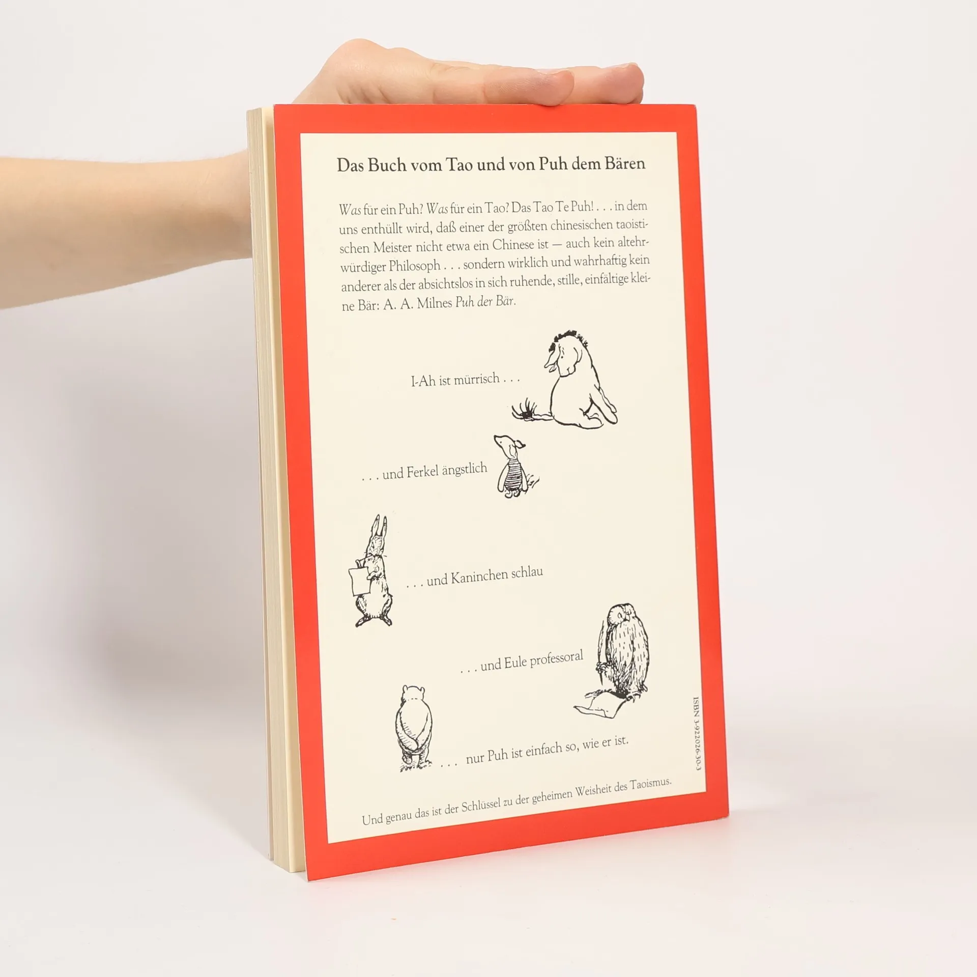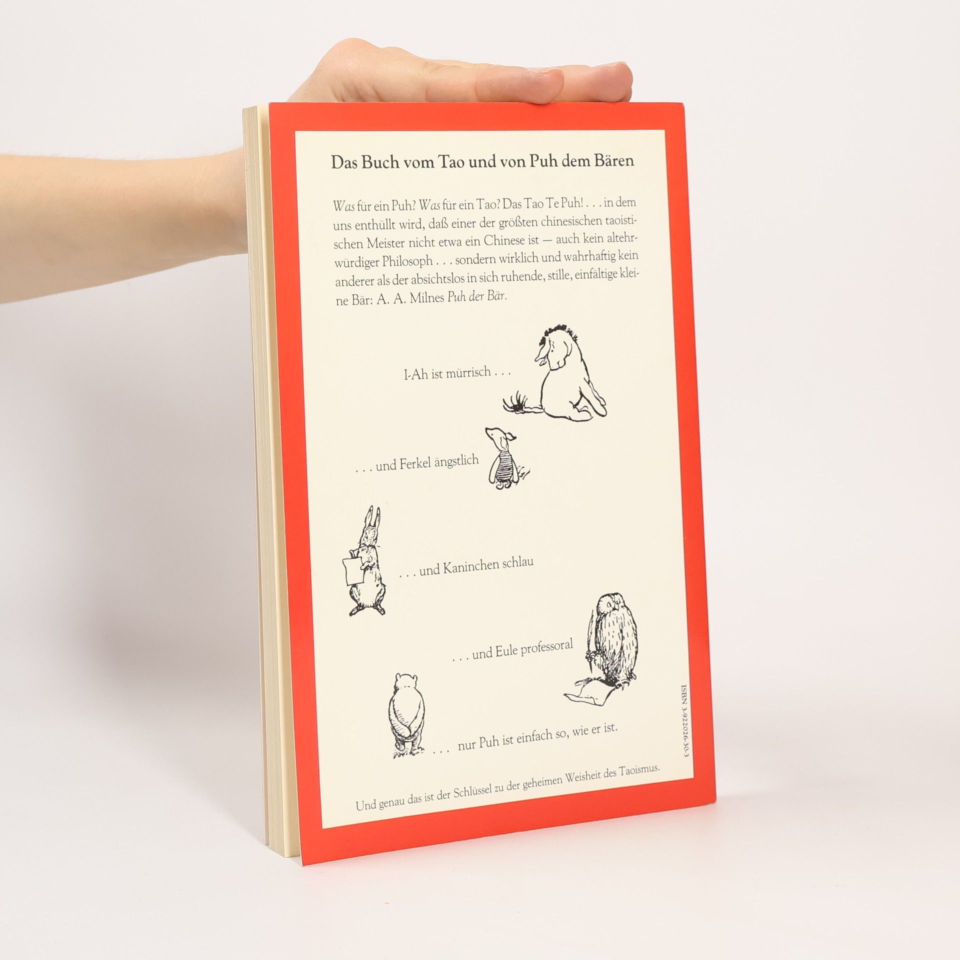 Was für ein Puh? Was für ein Tao? Das Tao Te Puh, in dem uns enthüllt wird, daß einer der größten chinesischen taoistischen Meister nicht etwa ein Chinese ist - auch kein altehrwürdiger Philosoph, sondern wirklich und wahrhaftig kein anderer als der absichtslos in sich ruhende, stille, einfältige kleine Bär. I-Ah ist mürrisch.. ..und Ferkel ängstlich ..und Kaninchen schlau ..und Eule professoral ..nur Puh ist einfach so, wie er ist. Und genau das ist der Schlüssel zu der geheimen Weisheit des Taoismus.